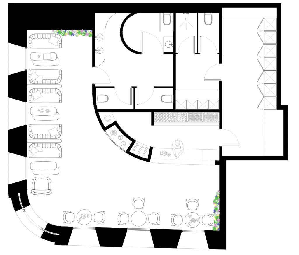 Envuelto en un ambiente cálido y aterciopelado, esta pastelería ofrece un lugar a sus usuarios donde parar, bajar el ritmo del día a día y sentarse a saborear el momento. Sus formas curvas, texturas y colores hacen del local un hogar, añadiendo elementos naturales que aportan frescura y vitalidad al espacio.